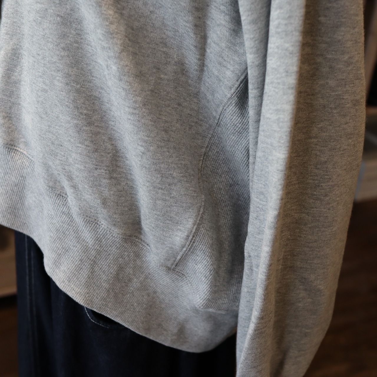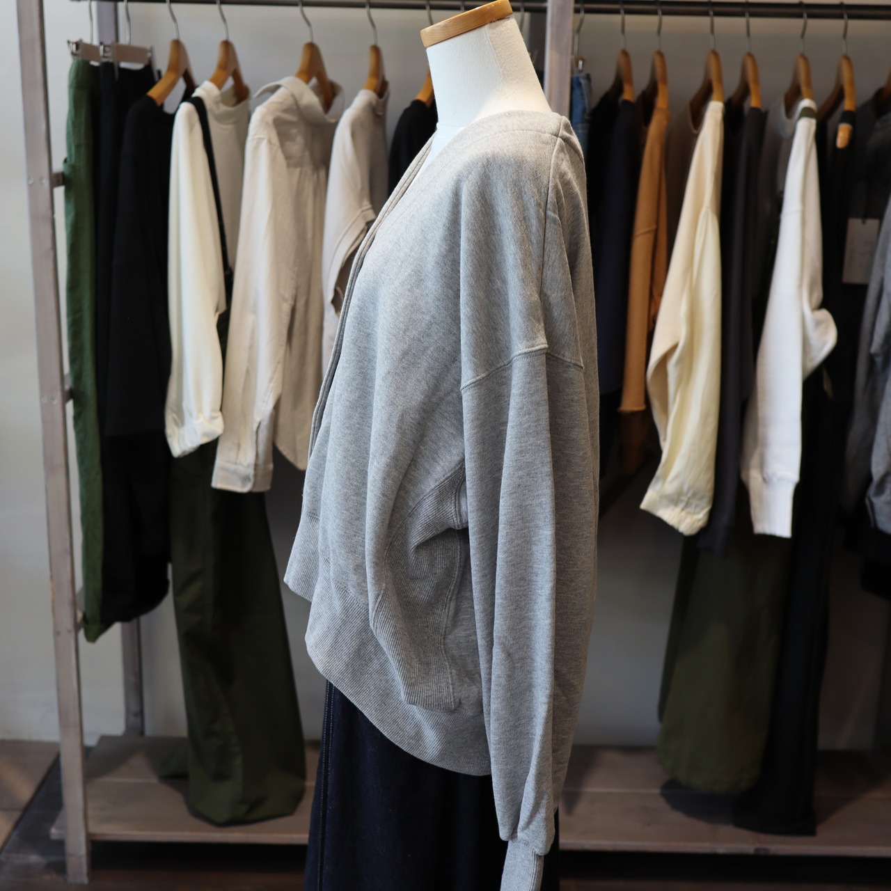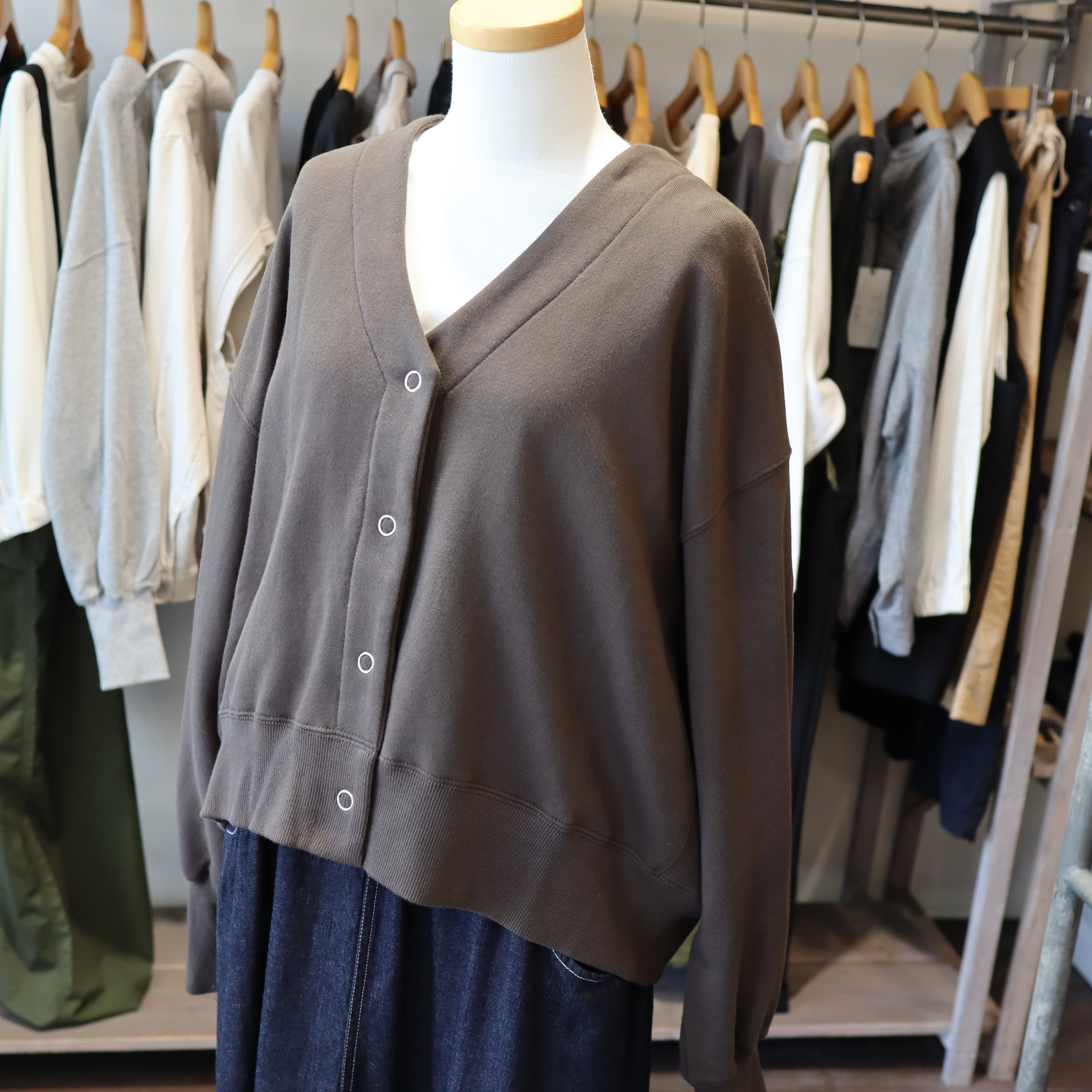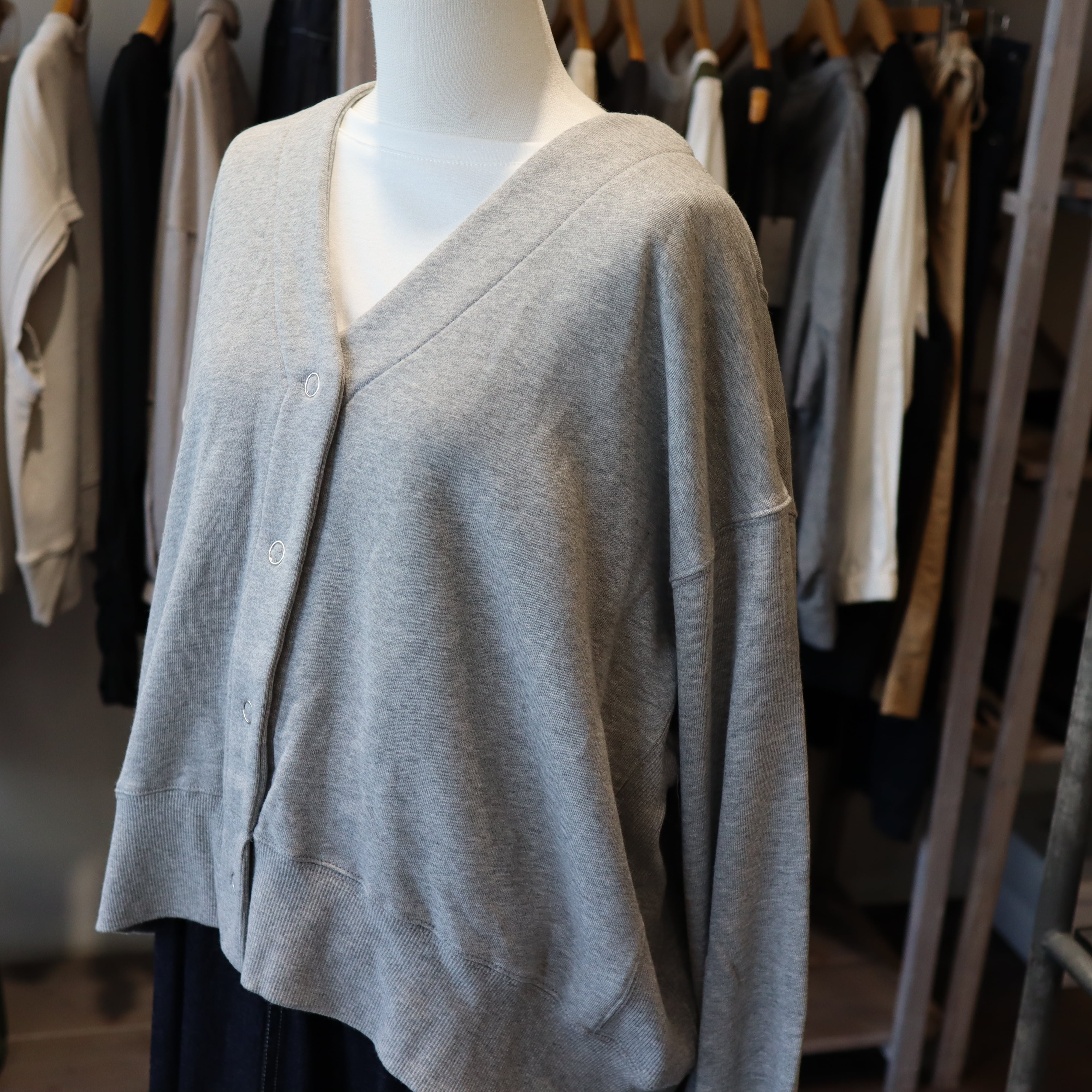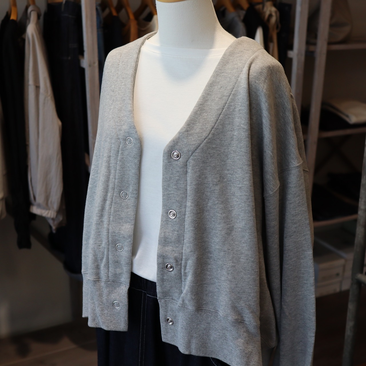 秋の立ち上がりにピッタリな裏毛素材のカーディガンです。柔らかくドライ感のあるT/C裏毛を使用して軽くTシャツなどの上に羽織っていただけます。前後差を付けたスッキリした着丈やワイドな身幅でとても着やすいです。ボリュームデザインの袖やVネック、スナップボタンなどシンプルになり過ぎず、でも使いやすい便利なアイテムです。