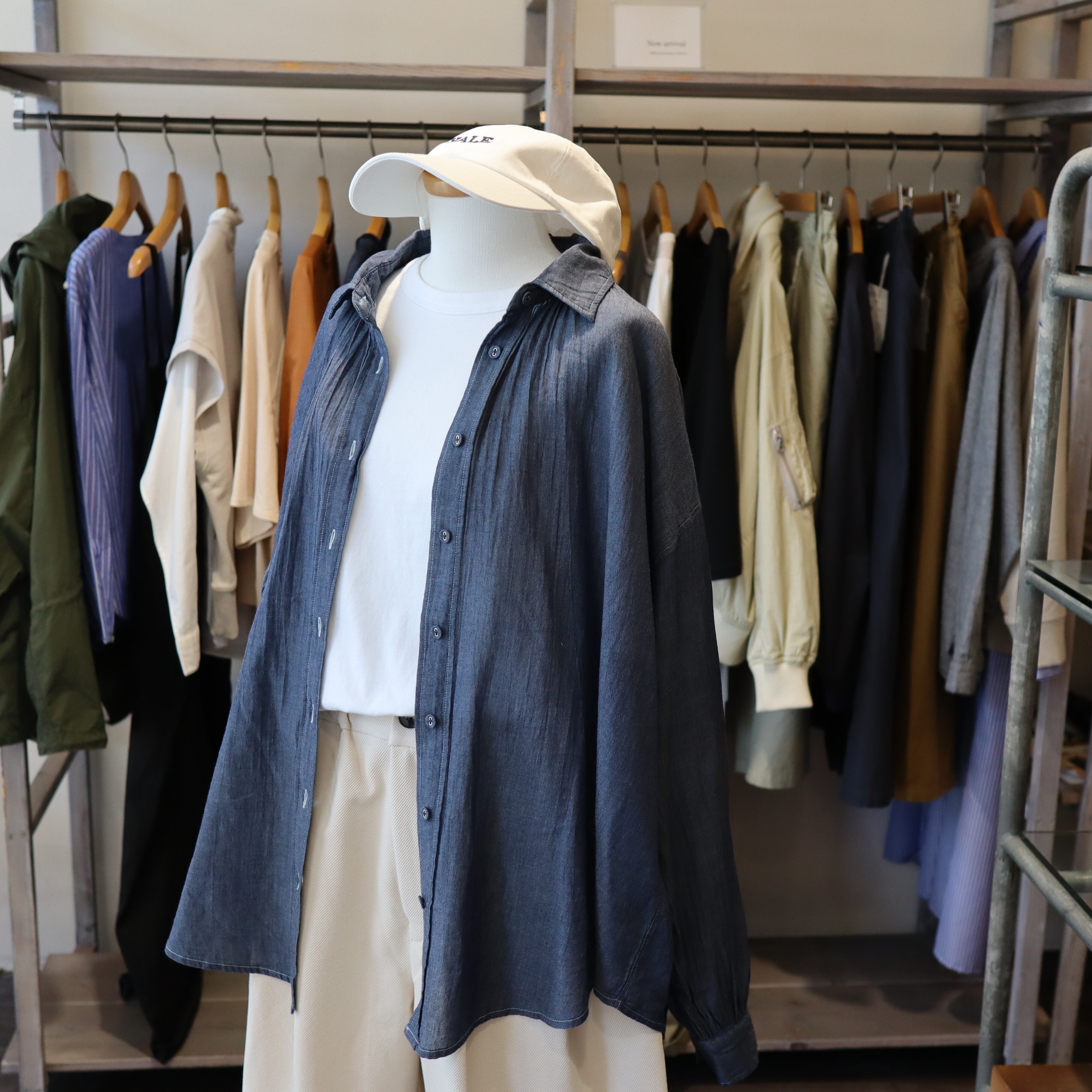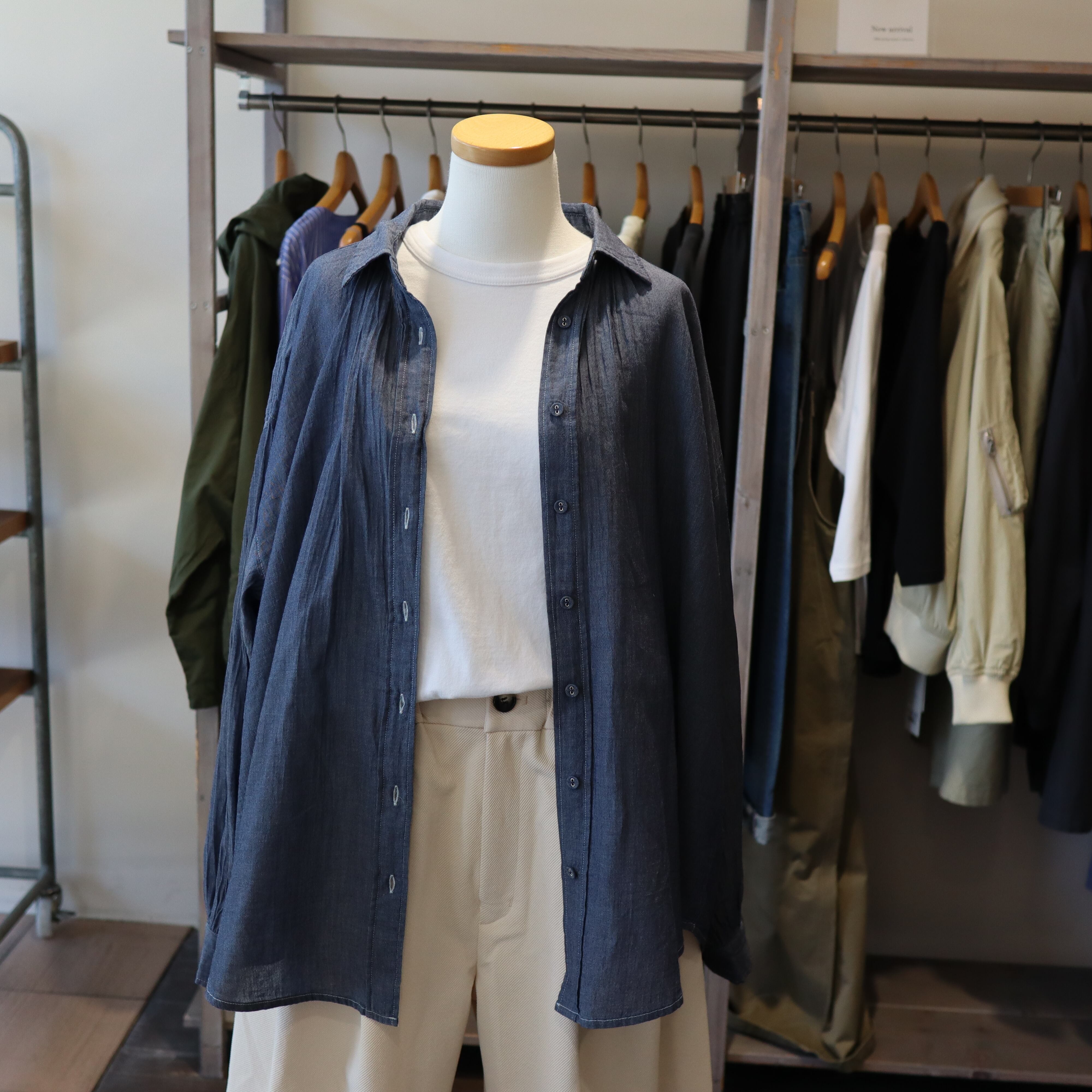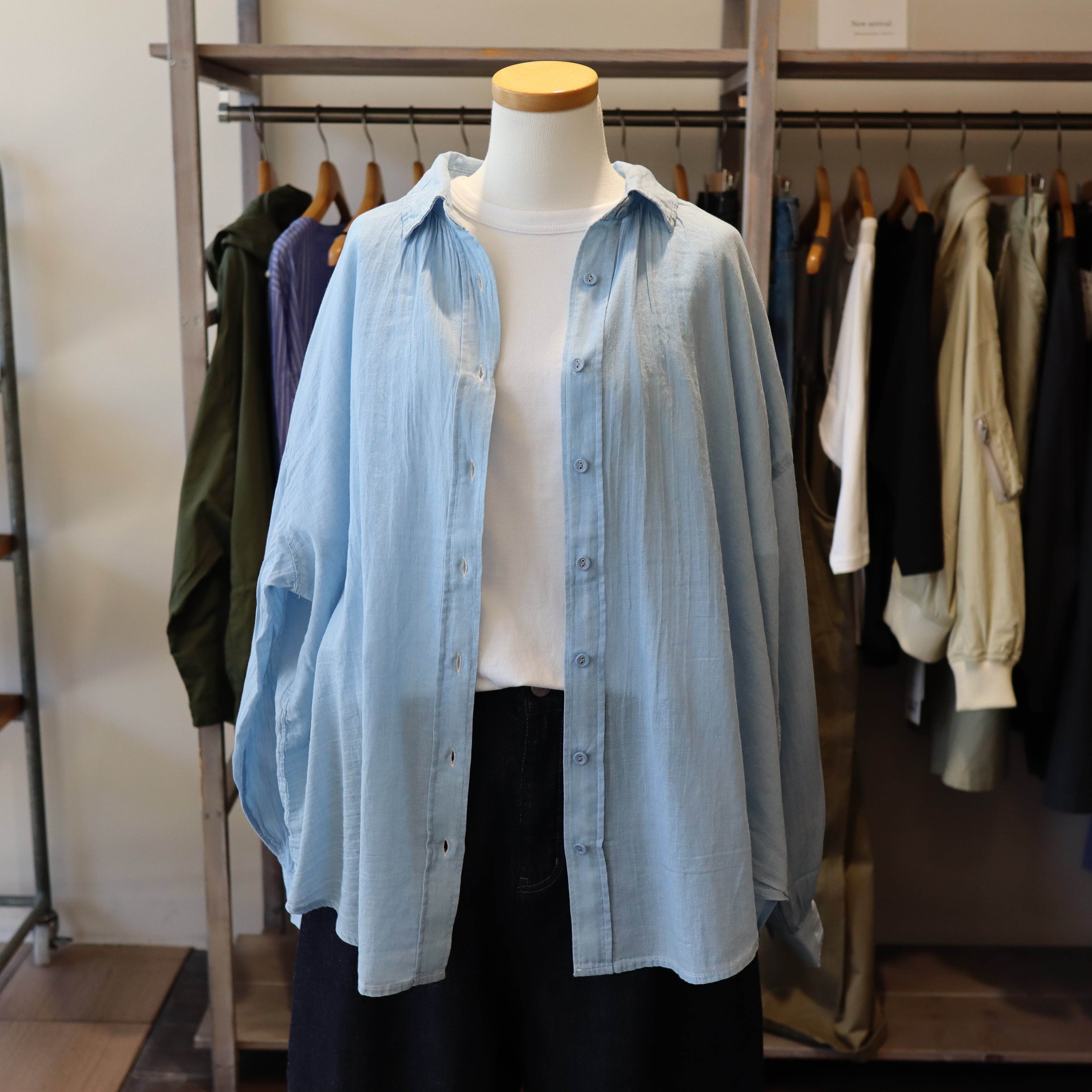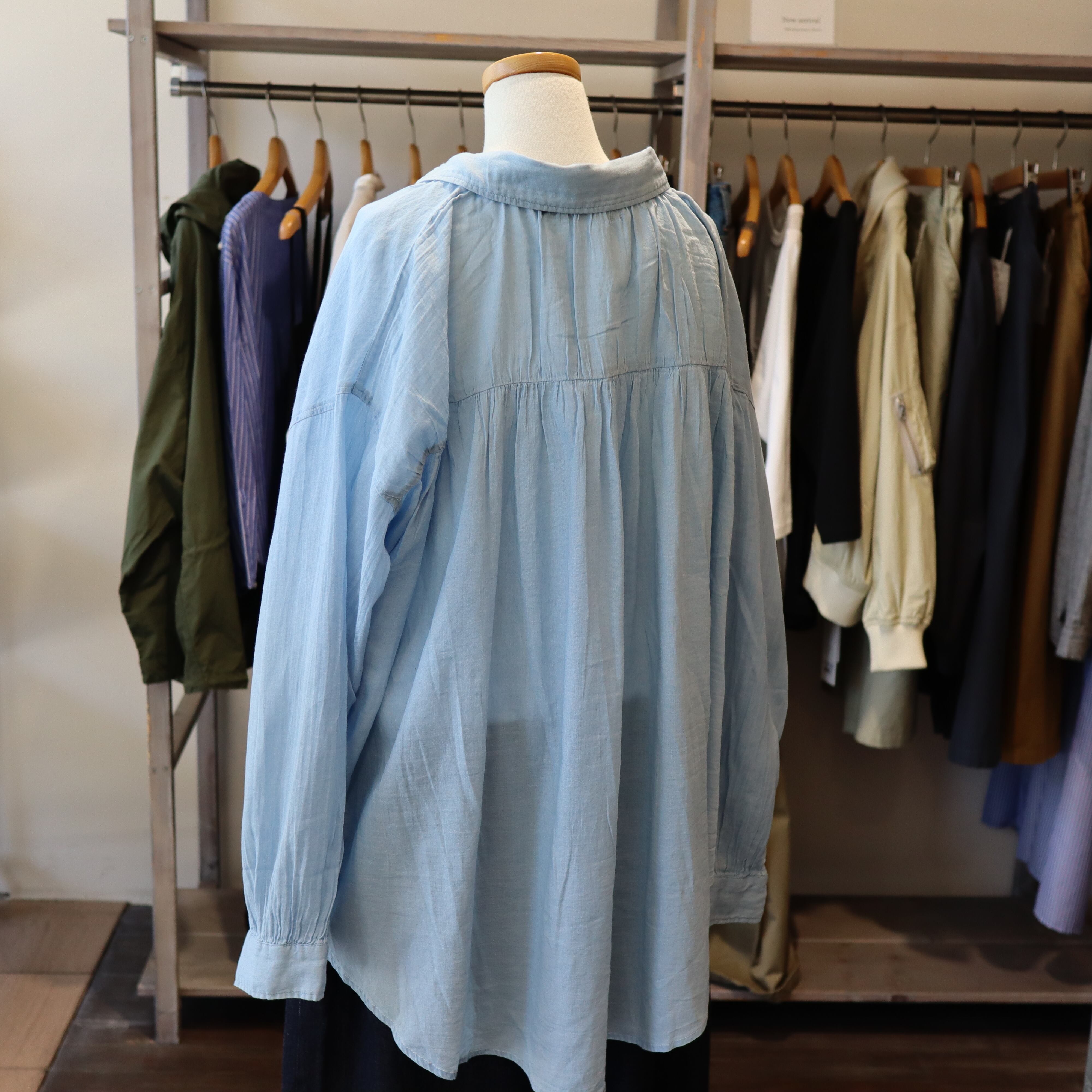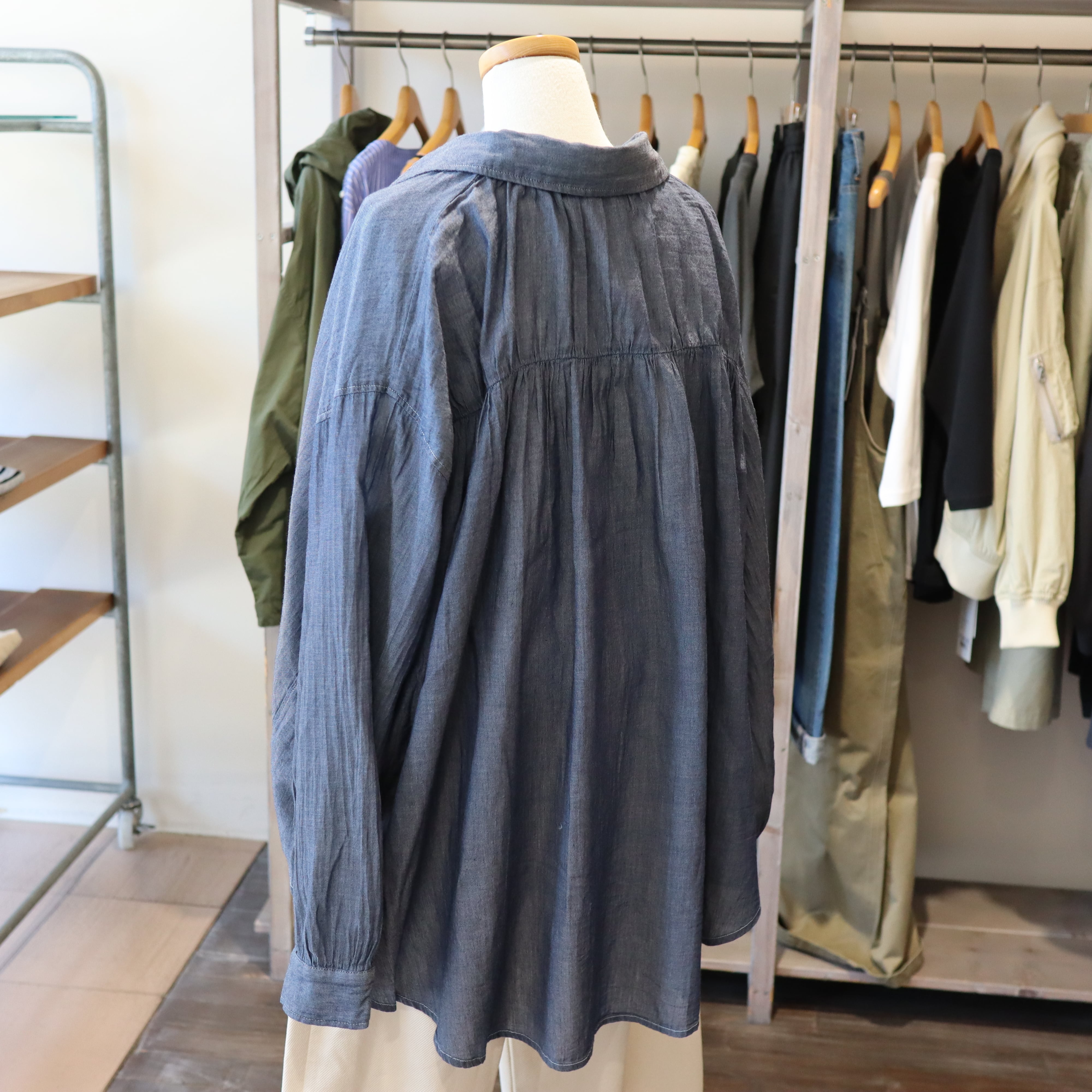 「2026 Spring」軽やかなシアーデニム生地を使用したバックギャザーシャツです。デザインにこだわったギャザーが背面に施されており女性らしいシルエットを演出します。とても柔らかくガーゼの様な素材感で夏のエアコン避けまで長い期間活躍しそうなアイテムです。自宅でのお洗濯も可能で、多少シワが有っても大丈夫な感じがオススメです。長めの着丈で少し襟を抜いて着ていただいてもバランスが良い商品です。