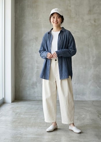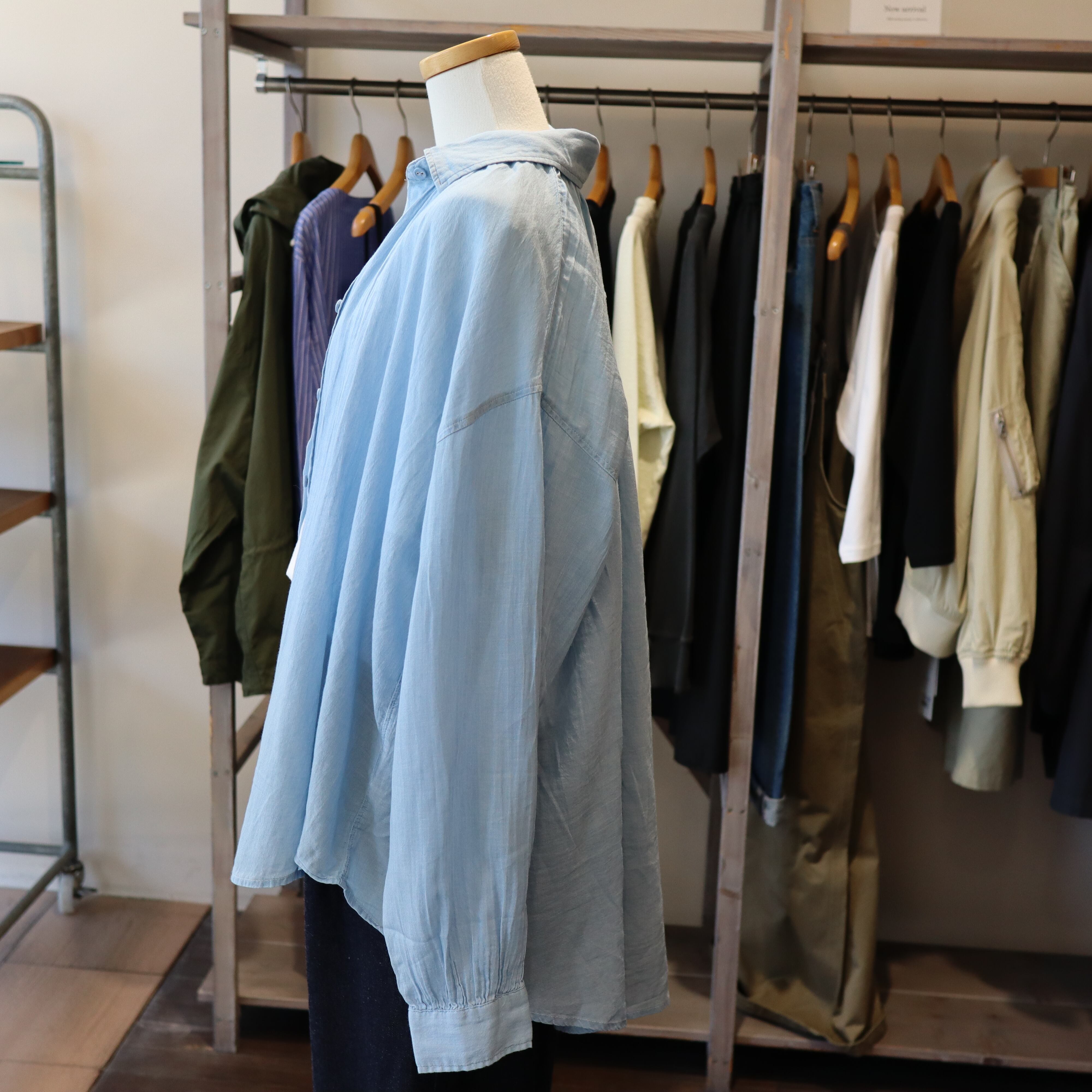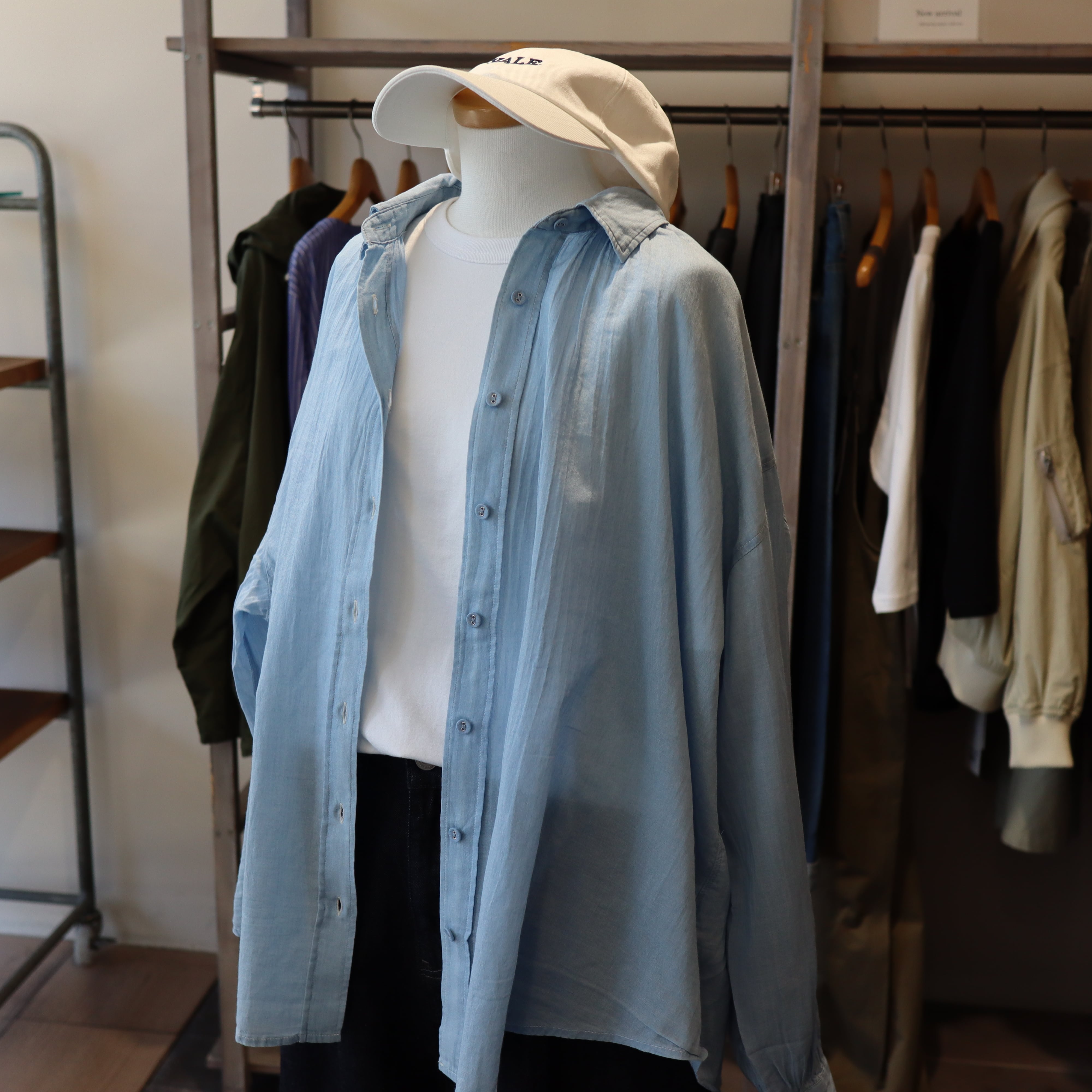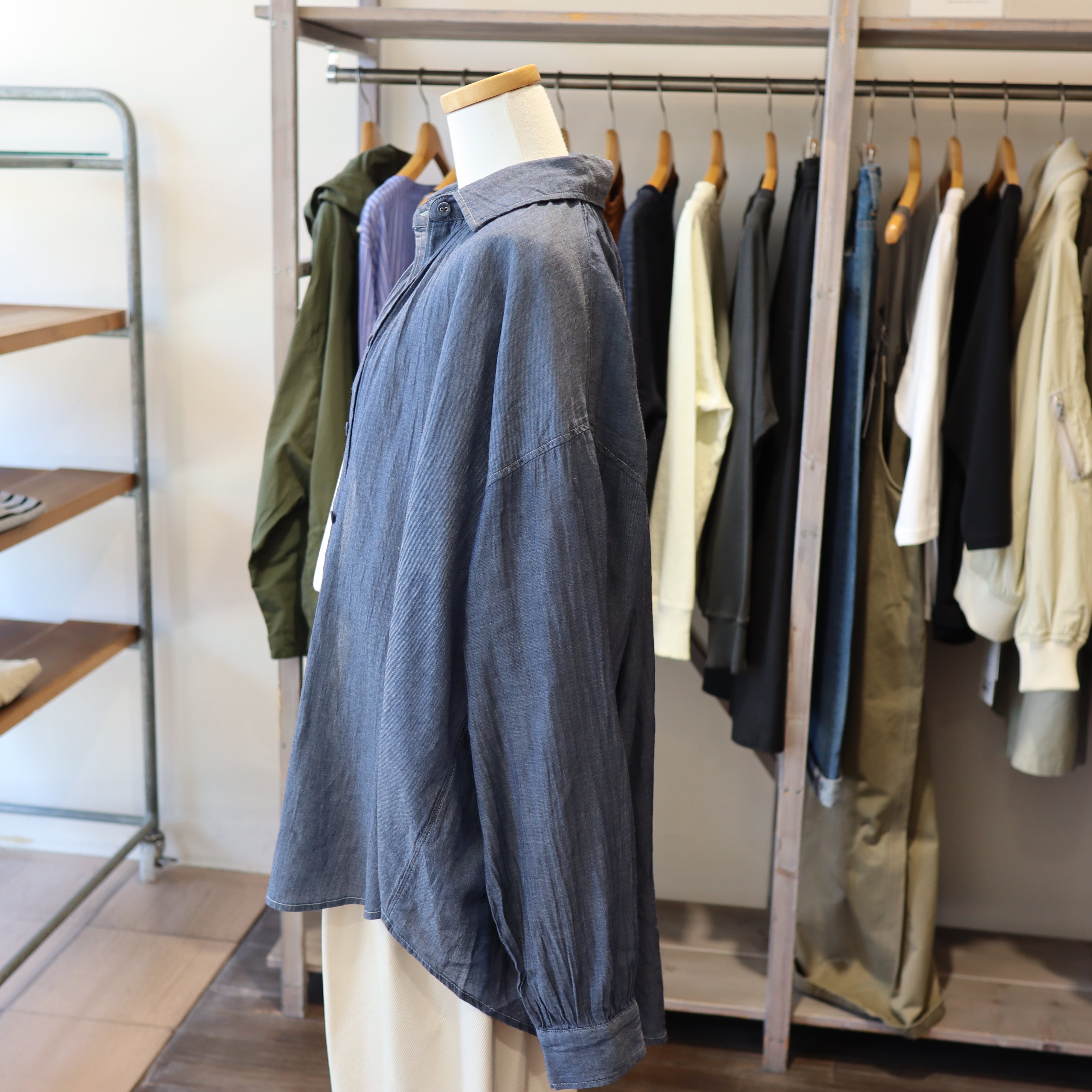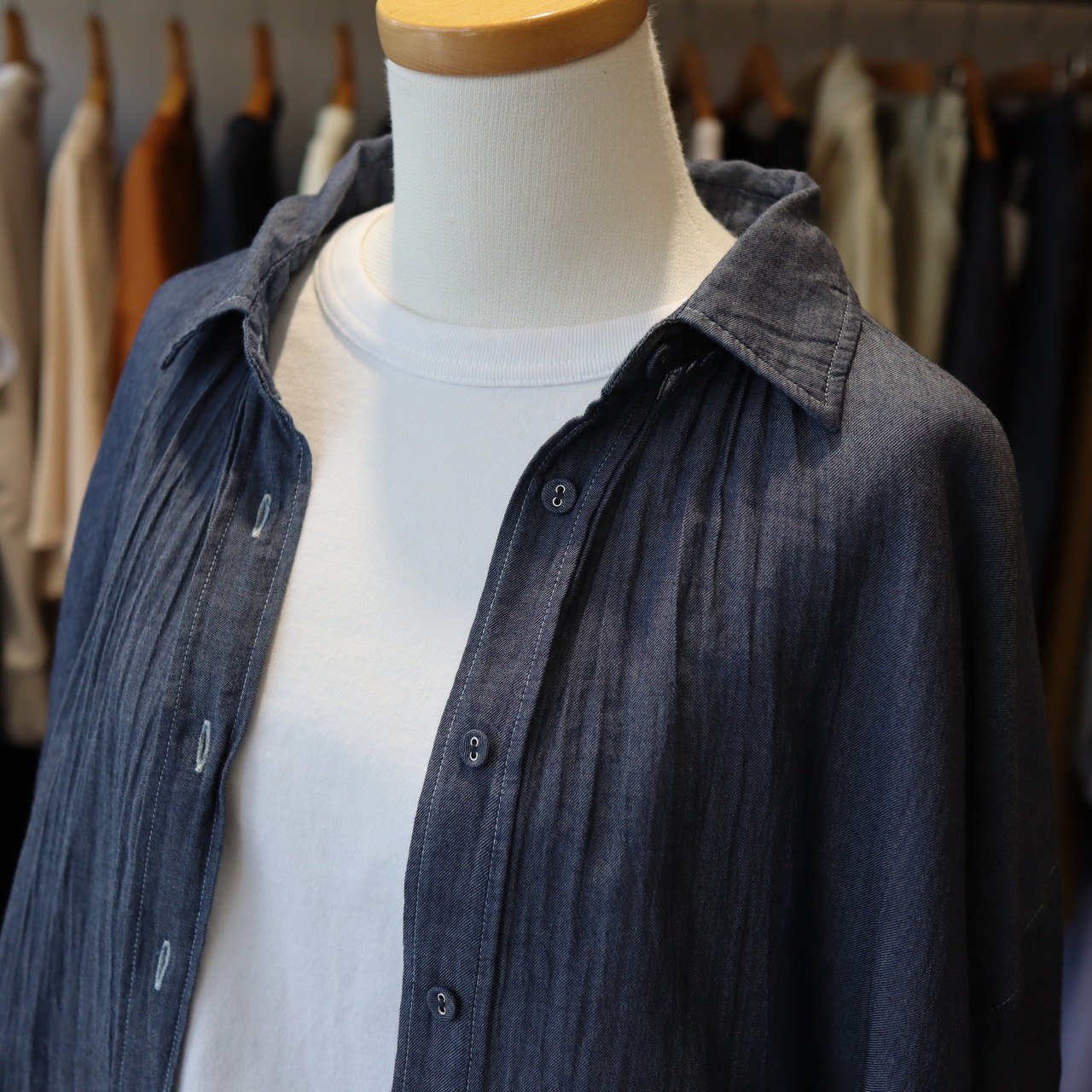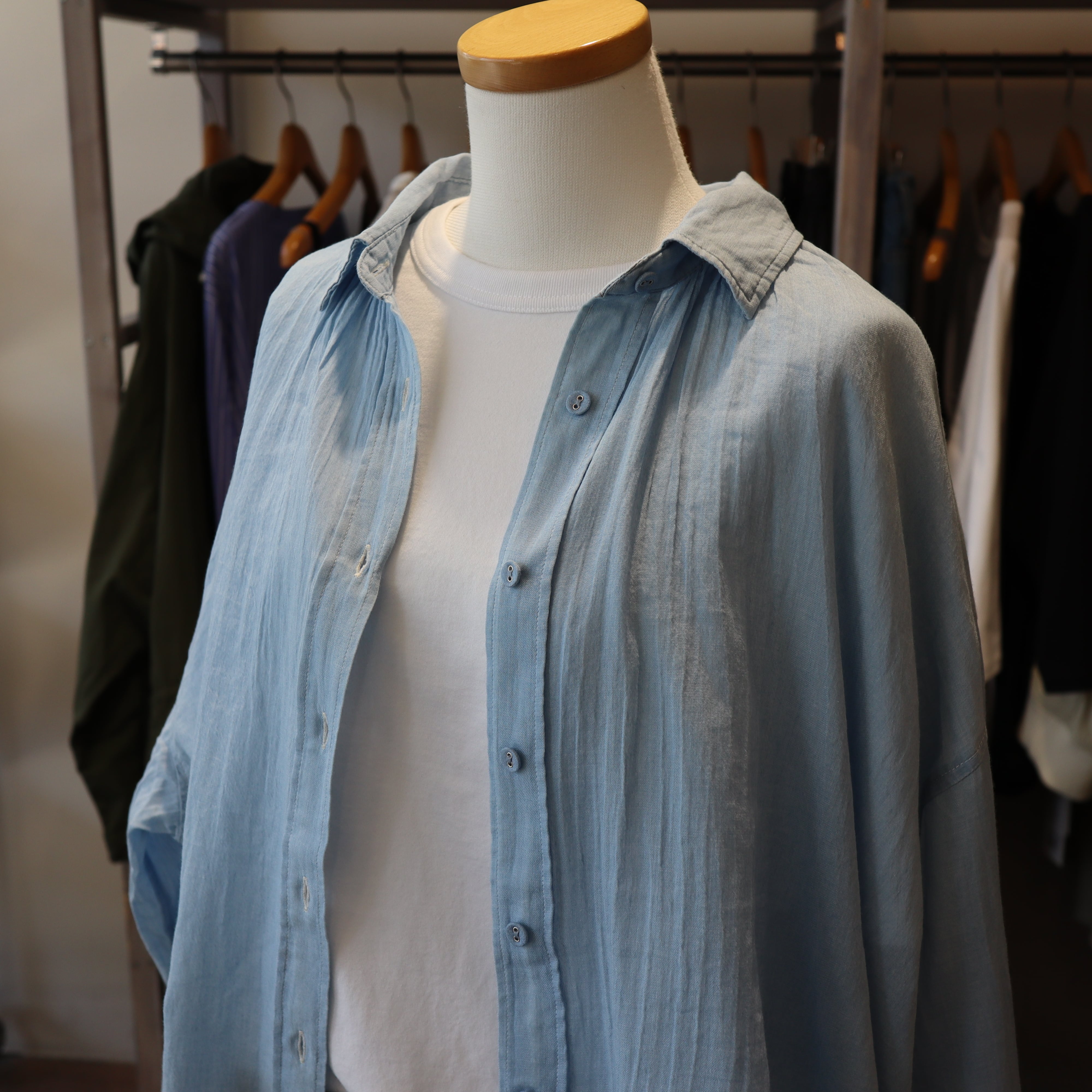 「2026 Spring」軽やかなシアーデニム生地を使用したバックギャザーシャツです。デザインにこだわったギャザーが背面に施されており女性らしいシルエットを演出します。とても柔らかくガーゼの様な素材感で夏のエアコン避けまで長い期間活躍しそうなアイテムです。自宅でのお洗濯も可能で、多少シワが有っても大丈夫な感じがオススメです。長めの着丈で少し襟を抜いて着ていただいてもバランスが良い商品です。