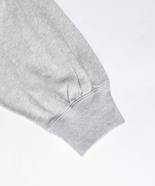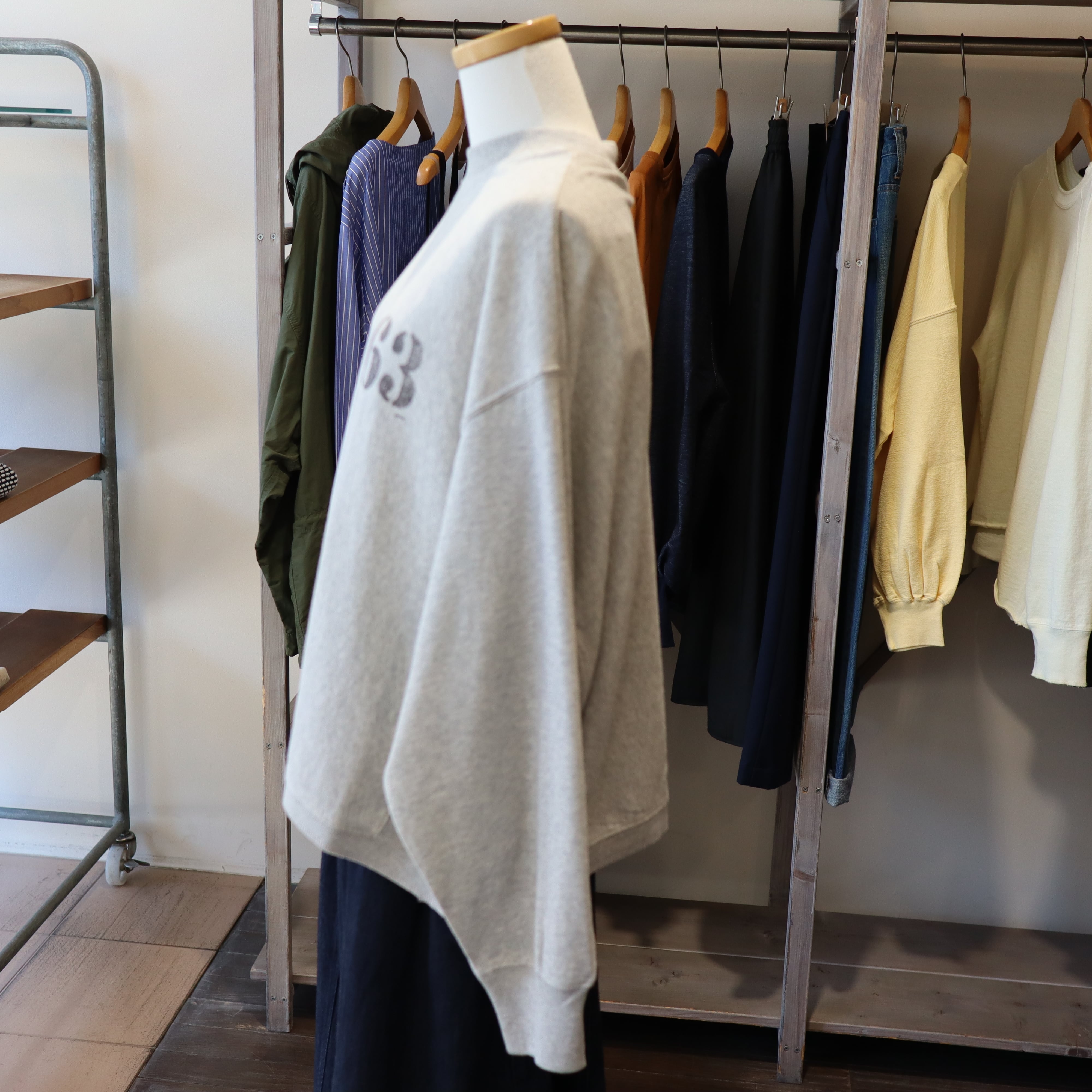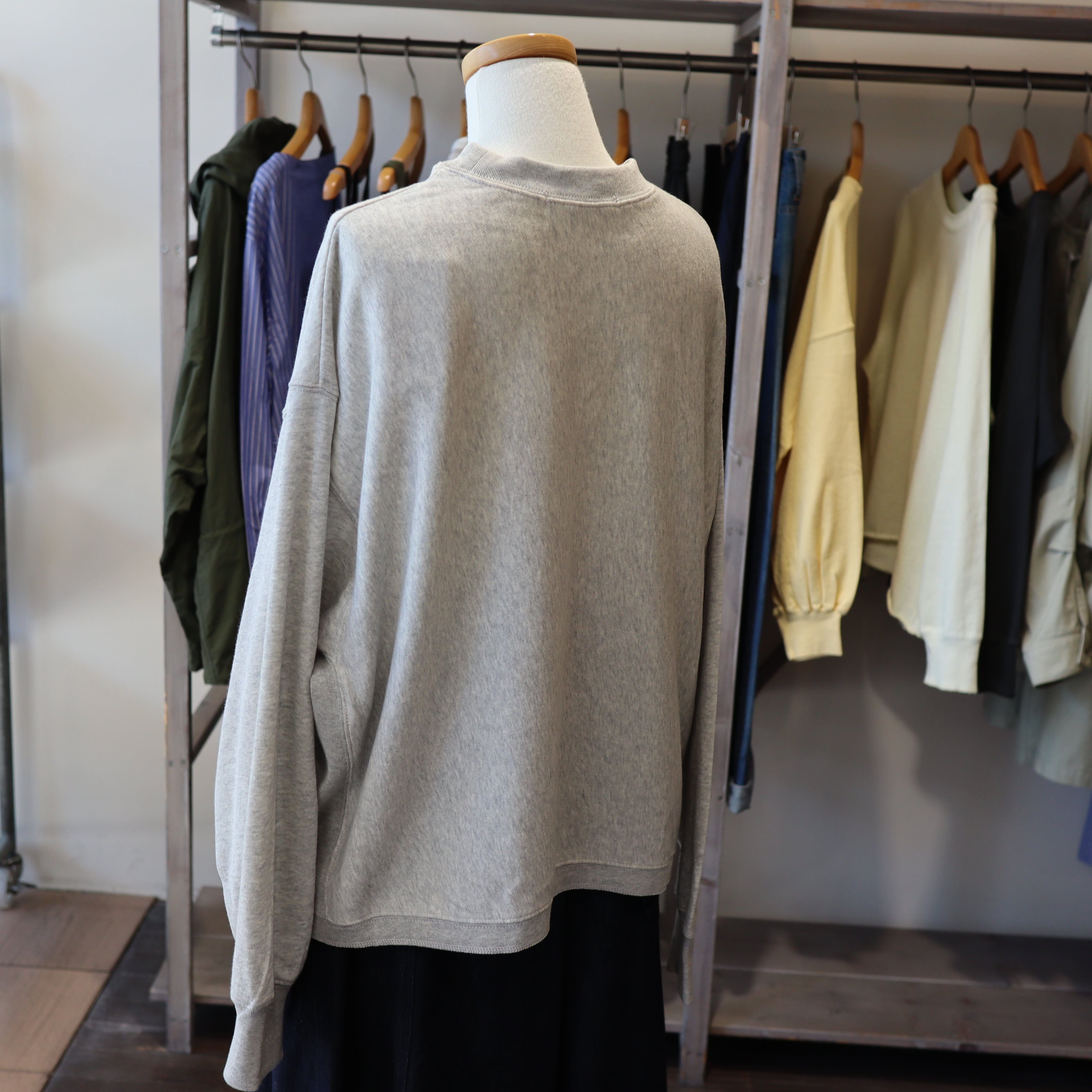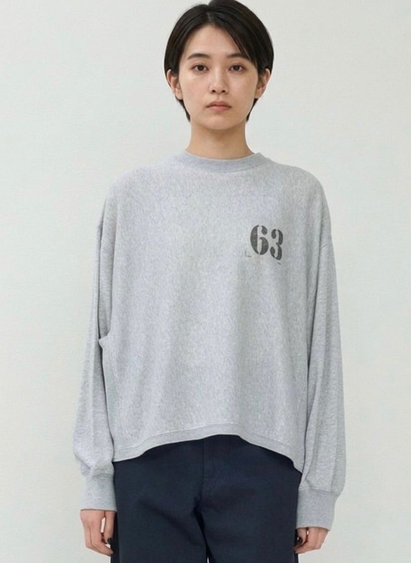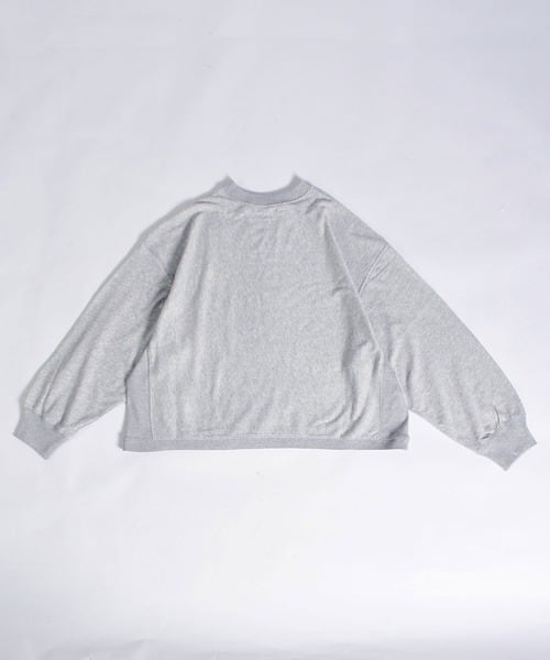 「JHON BULL 2026 Spring」ガーゼの様に柔らかく肌触りの良いミニ裏毛素材のモックネックのスウェットプルオーバーです。少しドルマンスリーブのようなデザインでゆったりとしたアームホールでストレスを感じない着心地です。ややワイドなデザインですが短めの着丈でスッキリ見えます。ワイドパンツやロングスカートなどボリュームの有るボトムとの相性が良さそうです。ナンバースタンプは一点一点手押ししており、位置やカスレ具合等個体差がございます。手仕事の味わいをお楽しみください