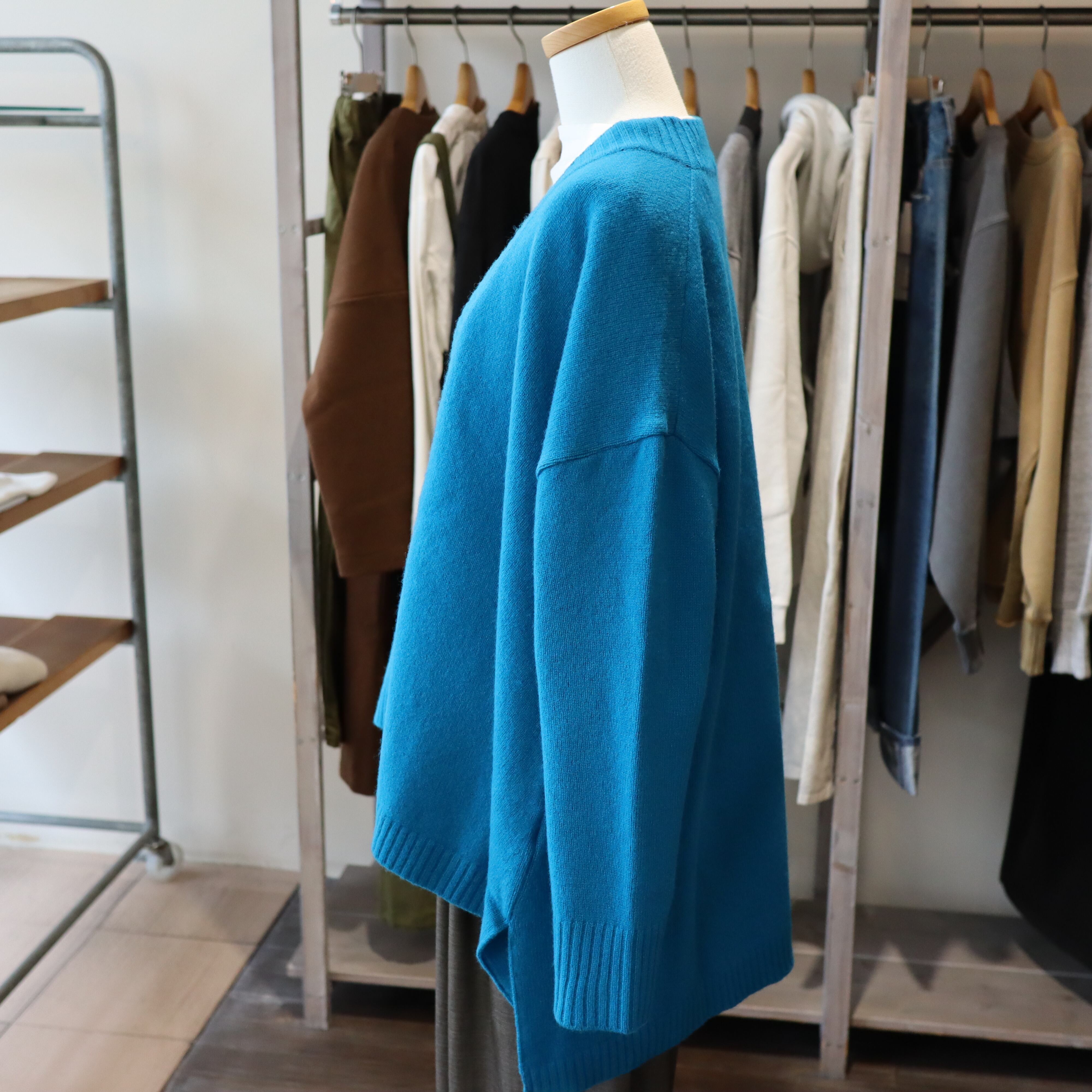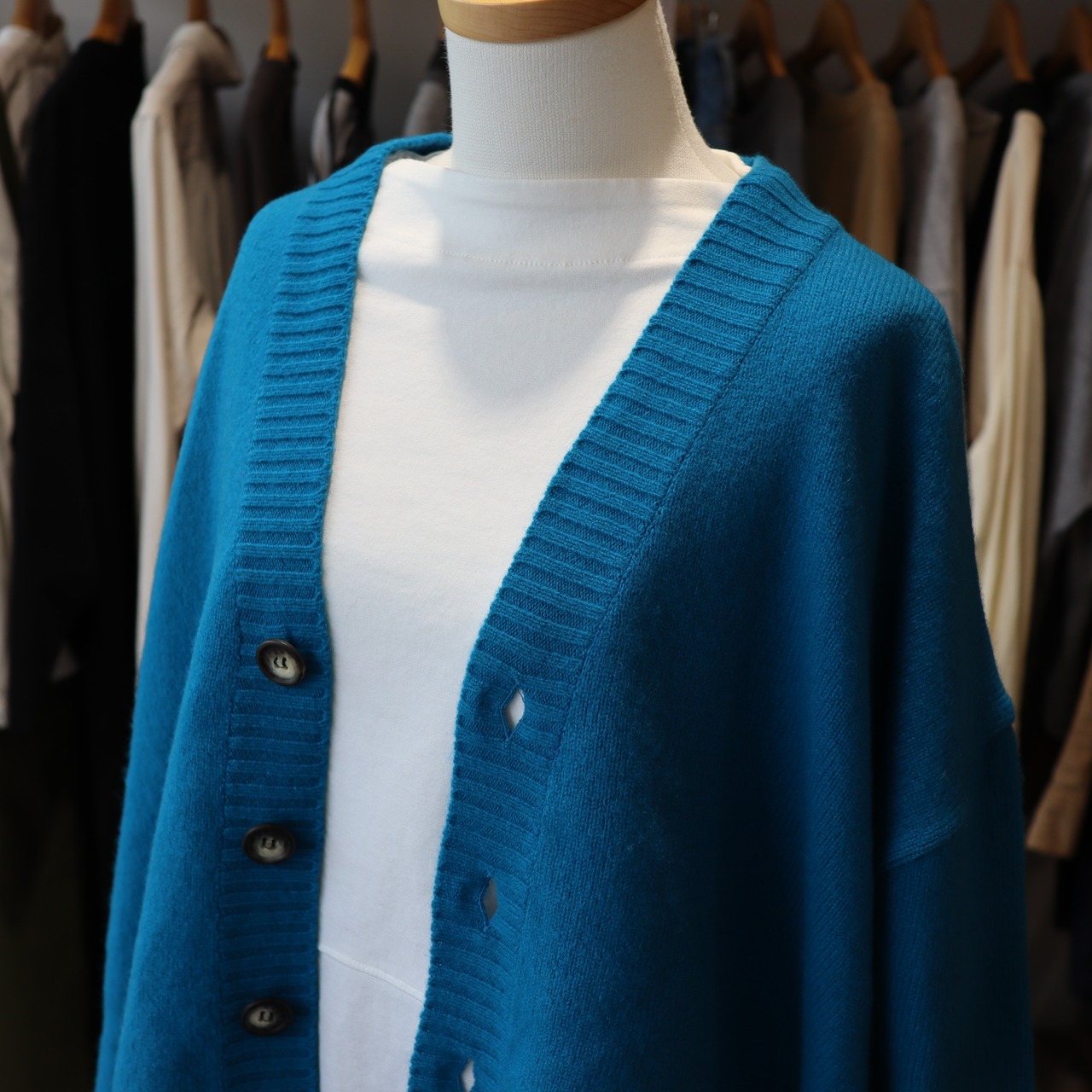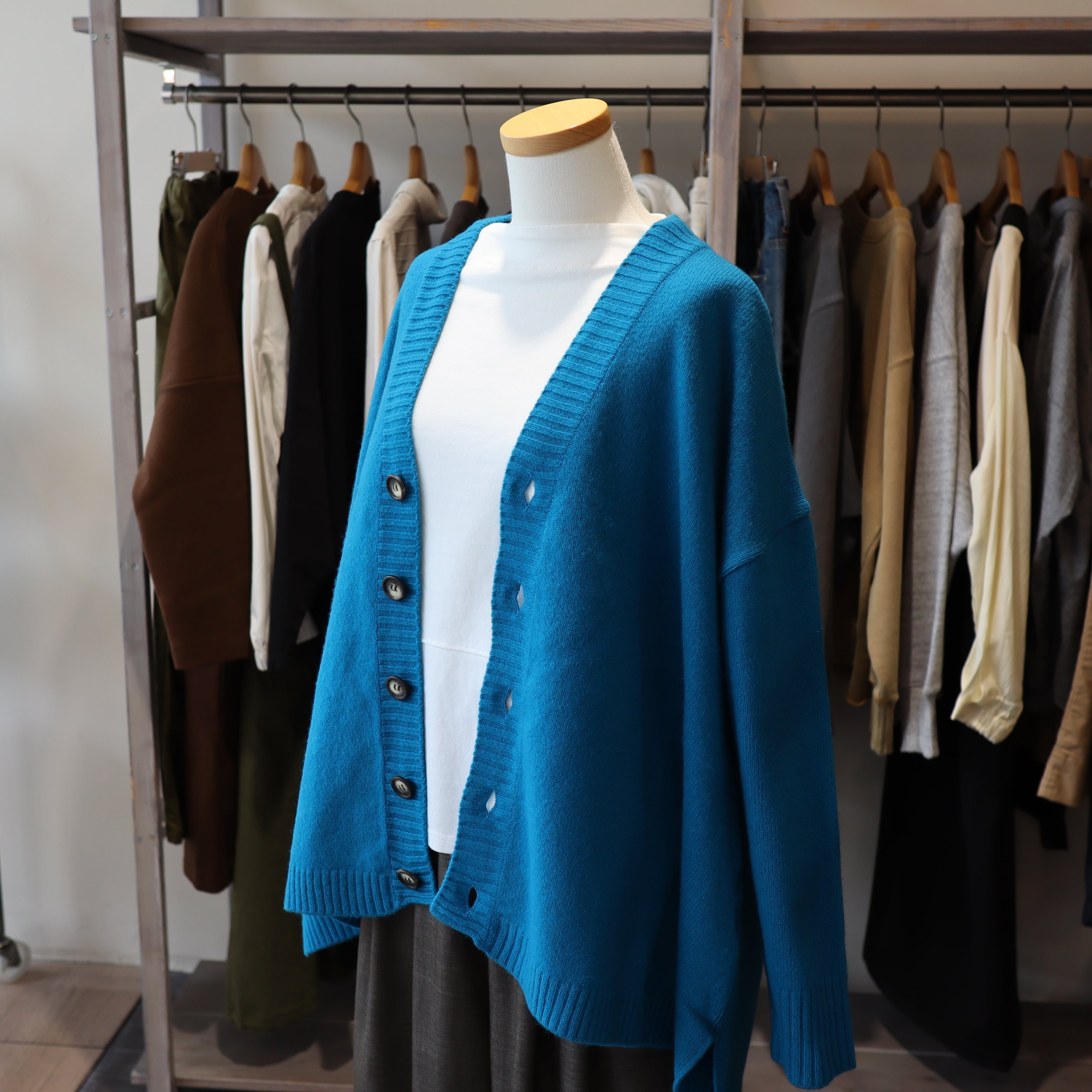 「NARU」の人気商品、タスマニアラムウール100%のカーディガンです。繊維の柔らかい子羊の毛を使用した生地でふっくらとした温かみのあるニットに仕上がっています。Vネックの襟ぐりは重くなりがちな冬のコーディネートに抜け感をプラスしてくれます。フレア感のあるシルエットや前後差のあるデザインがバランスが良く合わせやすそうです。Aラインですが細めの袖のデザインでスッキリ見えます。とても柔らかくチクチクも無く自宅でお洗濯も可能なところも嬉しいポイントです。安心の「Made in Japan」